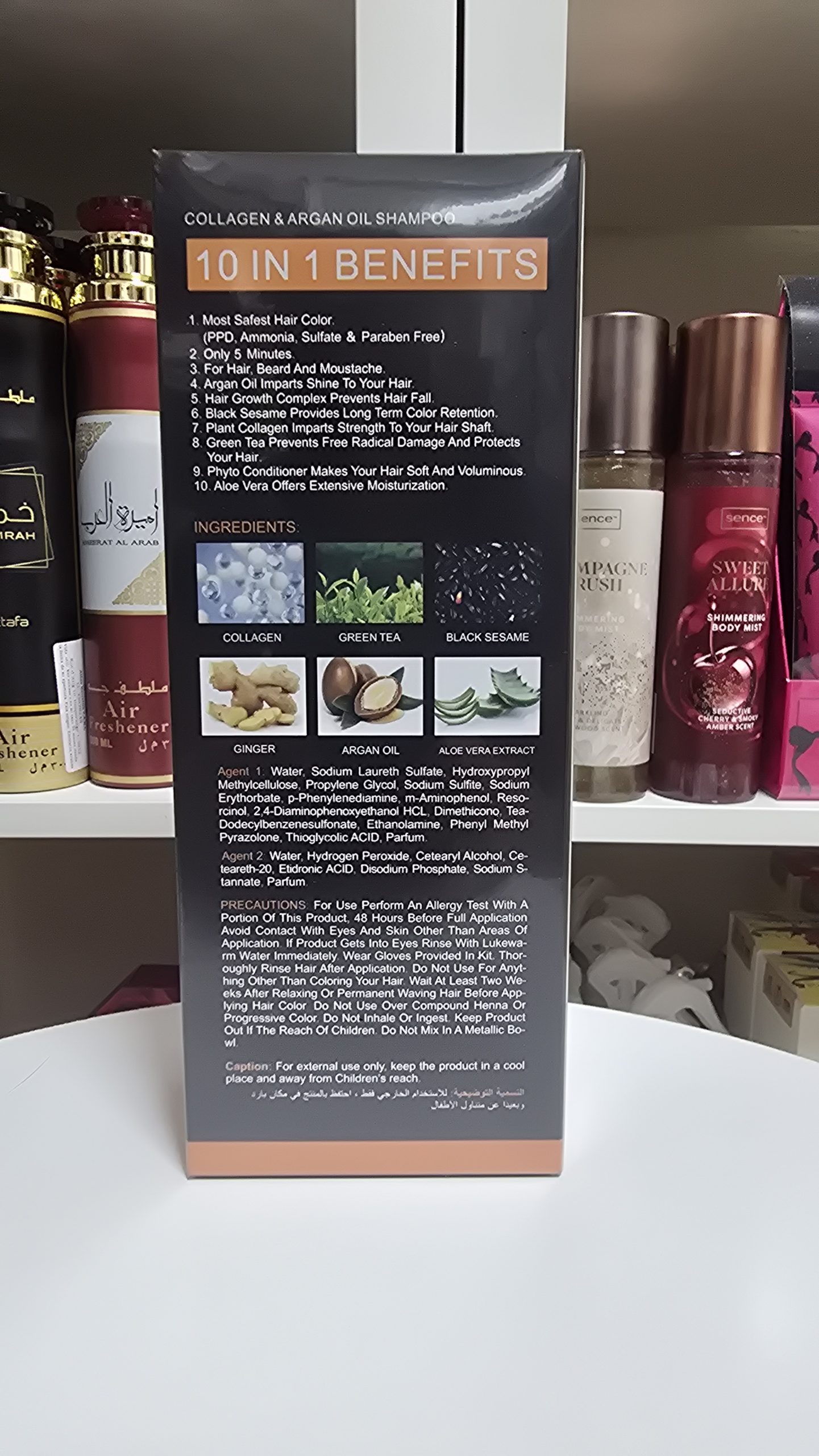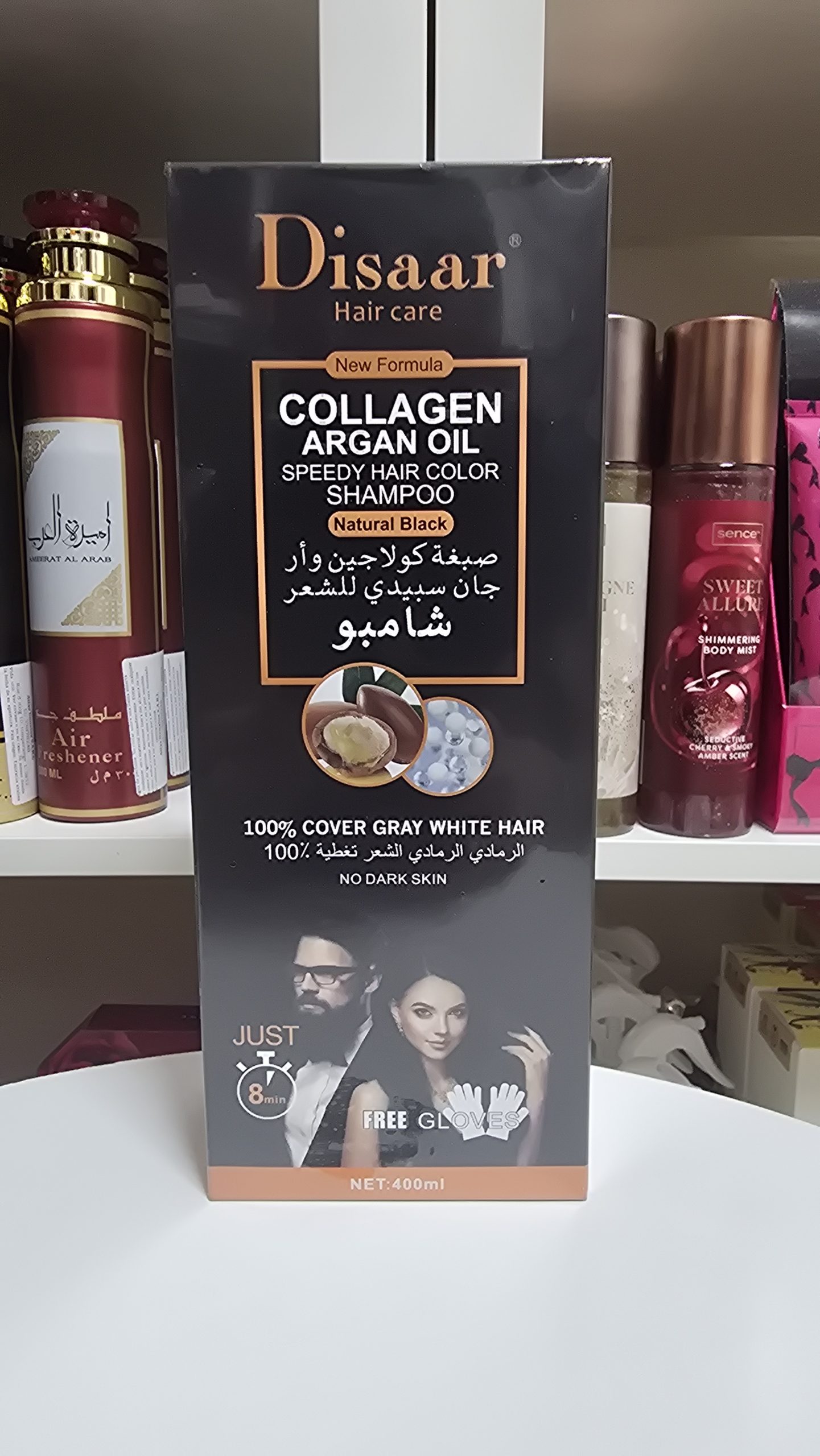 champú tinte negro Disaar,este champú teñido aporta brillo y nutrientes a tu bello evitando su sequedad y encrespamiento,contiene estracto de ginseng,no tiene olor irritante ni aditivos nocivos,te permite teñir tu cabelloentre 5 y 15 minutos ,facil de usar y con un acabado natural