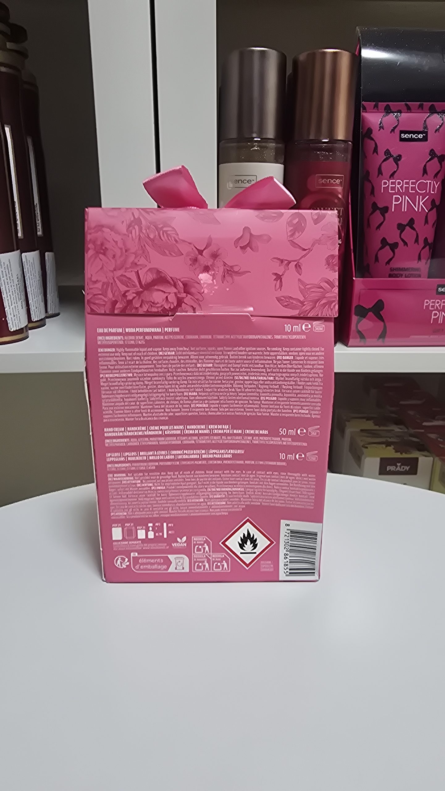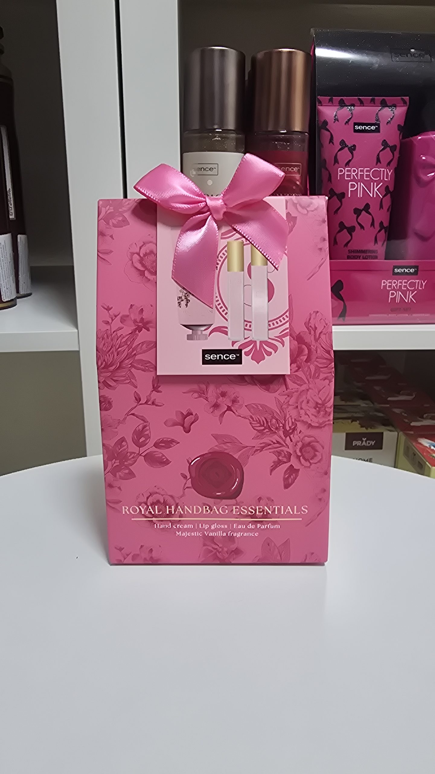 set para bolso compuesto de crema de manos,lip gloss y agua de perfume con patrones florales y de vainilla